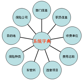 1)系统字典分为:部门信息、职员信息、收费单位,保险公司,目的地,费用名称,违章项目,车管所,保险种类等。