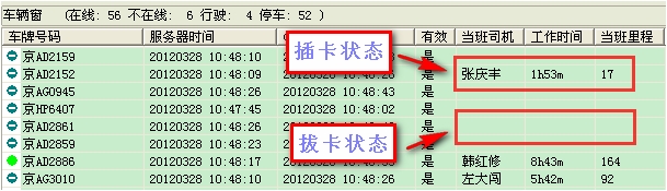 物流配送企业为每个驾驶员订制专属智能IC卡,做到每个驾驶员人手一卡,上车插卡;如果设备配有语音播报功能,当驾驶员插卡时,平台为驾驶员下发语音提示,如:“驾驶员XXX 插卡成功,请注意行车安全”。同时,网络版客户端车辆窗内车辆信息也会有相应变化。(“当班司机”显示驾驶员姓名,“工作时间”、“当班里程”开始计算该驾驶员的工作时间及工作里程。)如图1