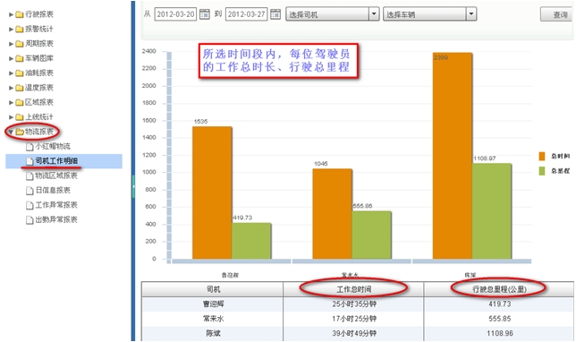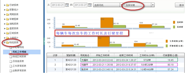 通过车载终端与相应的读卡设备连接,动态读取车辆IC卡信息,如:当班司机,并实时计算当班司机工作时长,工作里程等;且车辆定位系统后台配置相应报表,可根据驾驶员姓名,或车牌号码查询驾驶员工作时长、工作里程及车辆详细驾驶信息等。